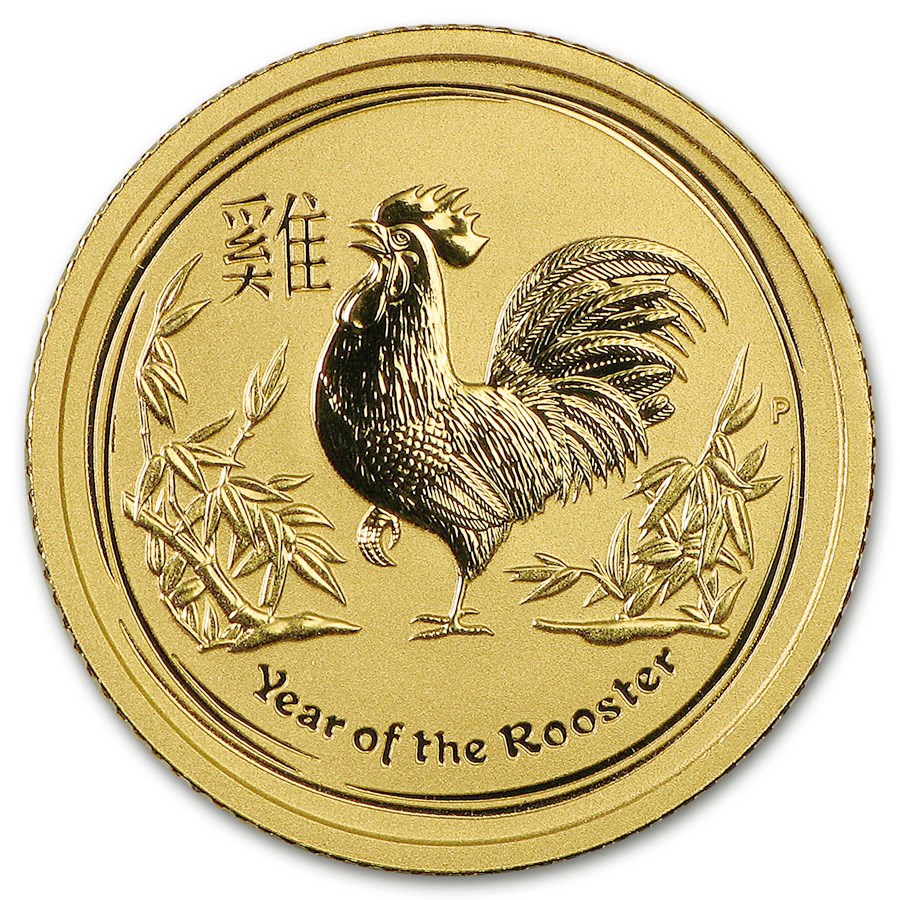 Nello zodiaco cinese, il Gallo rappresenta la vigilanza, la precisione, la diligenza e la fiducia - un segno associato alla chiarezza di intenti e al carattere forte. Il rovescio raffigura un gallo in piedi in una scena cinese stilizzata con bambù e foglie nel campo della moneta, accanto al carattere cinese per "Gallo", all'iscrizione "Anno del Gallo" e al tradizionale marchio di zecca "P" della Perth Mint. Il dritto presenta l'effigie di Ian Rank-Broadley della Regina Elisabetta II insieme alla denominazione e alla purezza dell'oro. Coniata dalla Perth Mint con 1/2 oncia (15,55 g) di oro fino 0,9999, la moneta ha un valore nominale di 50 dollari australiani, misura 30,6 mm di diametro e viene consegnata in una capsula protettiva.