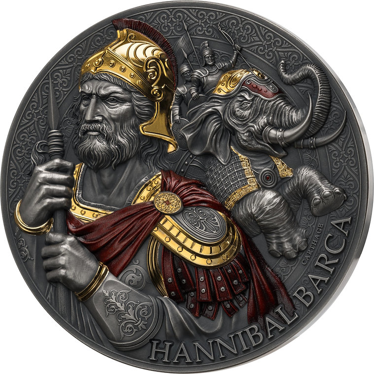 Questa impressionante moneta d'argento da collezione da 5 once è dedicata al grande condottiero Annibale Barca, la cui leggenda rivive nei dettagli ad alto rilievo. La drammatica finitura antica, la doratura e gli accenti rossi sottolineano la forza e la determinazione dell'eroe che attraversò le Alpi con i suoi elefanti da guerra. Il rovescio presenta Annibale circondato da simboli di antico potere e volontà inflessibile. La moneta viene fornita in un elegante cofanetto con certificato di autenticità. Edizione limitata a soli 750 esemplari in tutto il mondo.