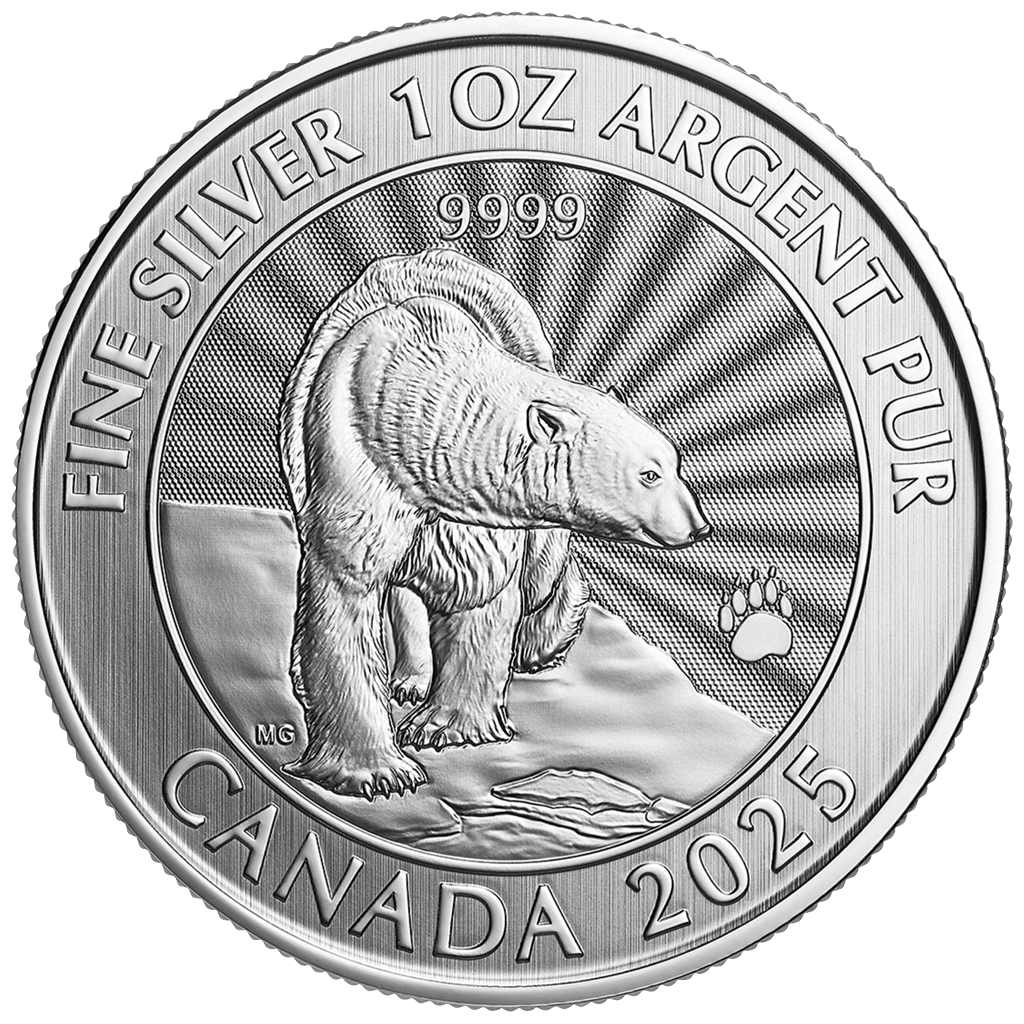 La moneta d'argento "Majestic Polar Bear" della Royal Canadian Mint è dedicata a uno dei simboli più iconici dell'Artico. Il rovescio raffigura un orso polare in piedi su una banchisa, di fronte a un'unica impronta di zampa, mentre lo sfondo è arricchito da raggi dinamici e stilizzati. Questo disegno prosegue il tema delle emissioni precedenti, raffigurando un cucciolo d'orso ormai maturo e indipendente, un'idea sottilmente rafforzata dall'impronta di zampa solitaria all'interno della composizione. La moneta ha una tiratura di 20.000 pezzi ed è presentata in un blister con un certificato di autenticità.