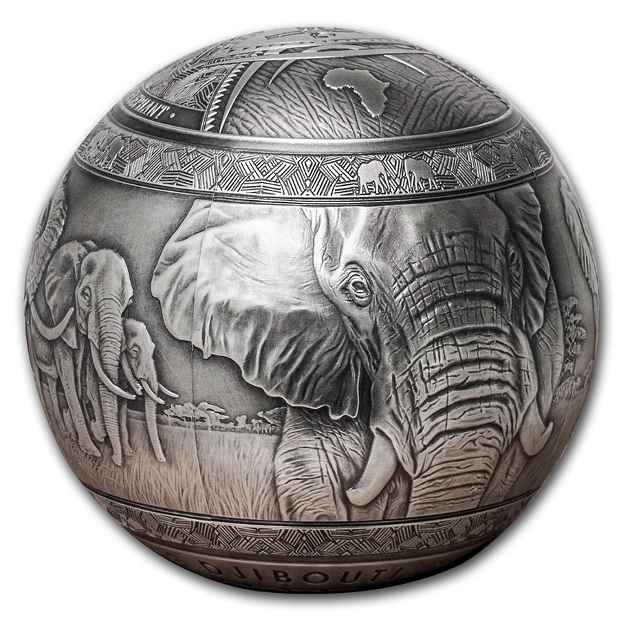 Questa impressionante moneta d'argento da 1 chilogrammo è dedicata a uno degli animali più maestosi del pianeta: l'elefante africano. La moneta ha una forma sferica unica e una finitura anticata che enfatizza la profondità e i dettagli del rilievo. Il rovescio raffigura un elefante in un disegno a 360 gradi che trasmette tutta la potenza e la grazia di questo animale. La moneta è coniata in argento fino 0,999 e ha un valore nominale di 1.000 franchi gibutiani. È stata emessa in un'edizione limitata di 199 esemplari in tutto il mondo e viene fornita in un elegante cofanetto con un certificato di autenticità.