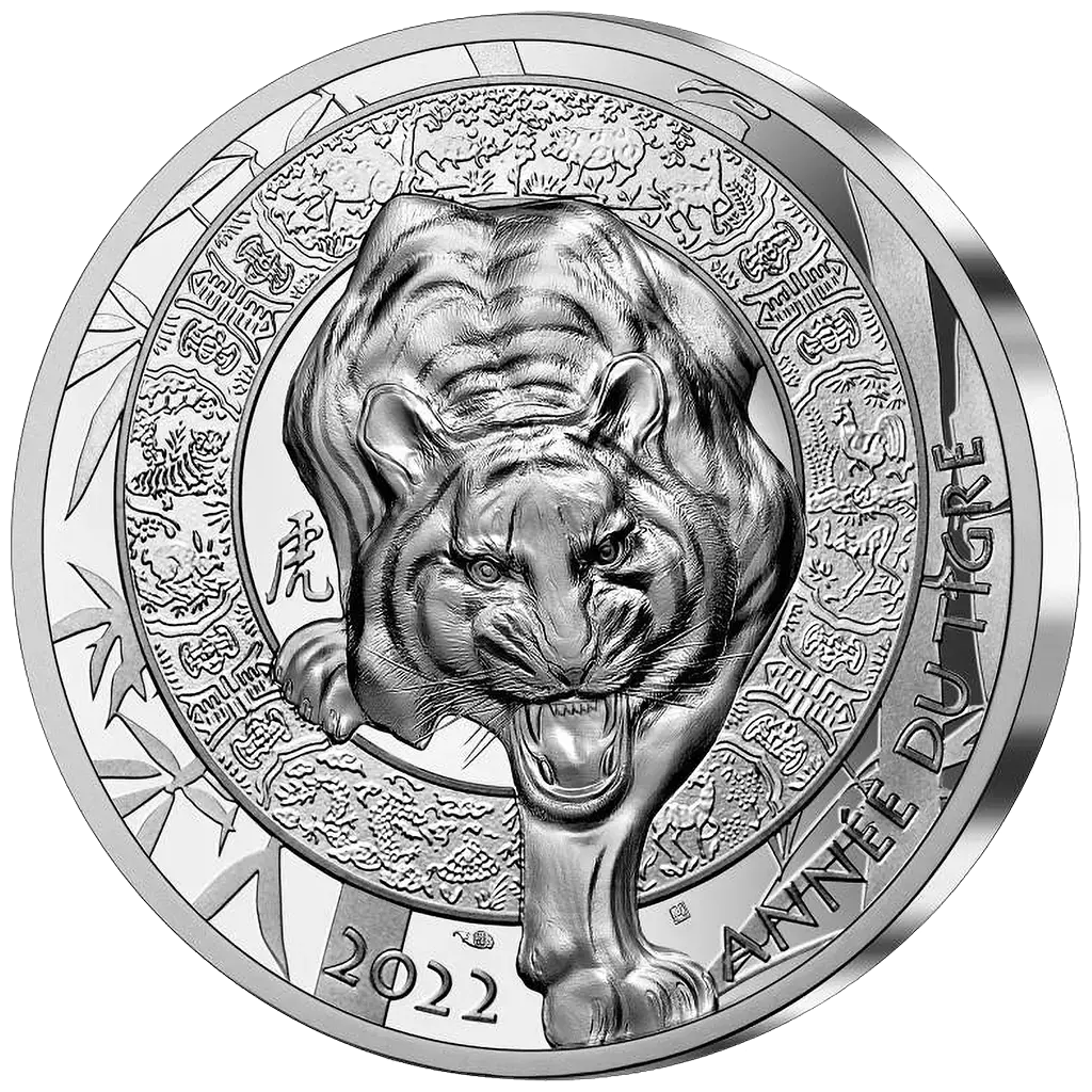 Coniata in qualità Proof in argento puro 0,999 e del peso di 1 oncia, questa moneta da collezione continua la serie del Calendario Cinese emesso dalla Monnaie de Paris. L'emissione del 2022 celebra l'Anno della Tigre, il terzo segno dello zodiaco cinese, tradizionalmente associato al coraggio, alla forza, all'indipendenza e alla leadership. Il rovescio presenta la raffigurazione centrale di una tigre circondata da un anello di motivi tradizionali cinesi. L'animale sembra muoversi all'interno della moneta attraverso il disegno di una porta di un tempio che si collega visivamente al dritto. A sinistra si trova l'ideogramma della tigre, calligrafato dall'artista Xian Ying Hong. L'anno 2022 e l'iscrizione Anno della Tigre appaiono lungo il cerchio esterno. Il dritto presenta tutti i dodici animali dello zodiaco cinese disposti intorno alla porta di un tempio tradizionale cinese. Il valore nominale di 20 euro è posizionato in alto a sinistra, mentre le iniziali RF appaiono sulla porta stessa. La tiratura è limitata a 3.000 pezzi.