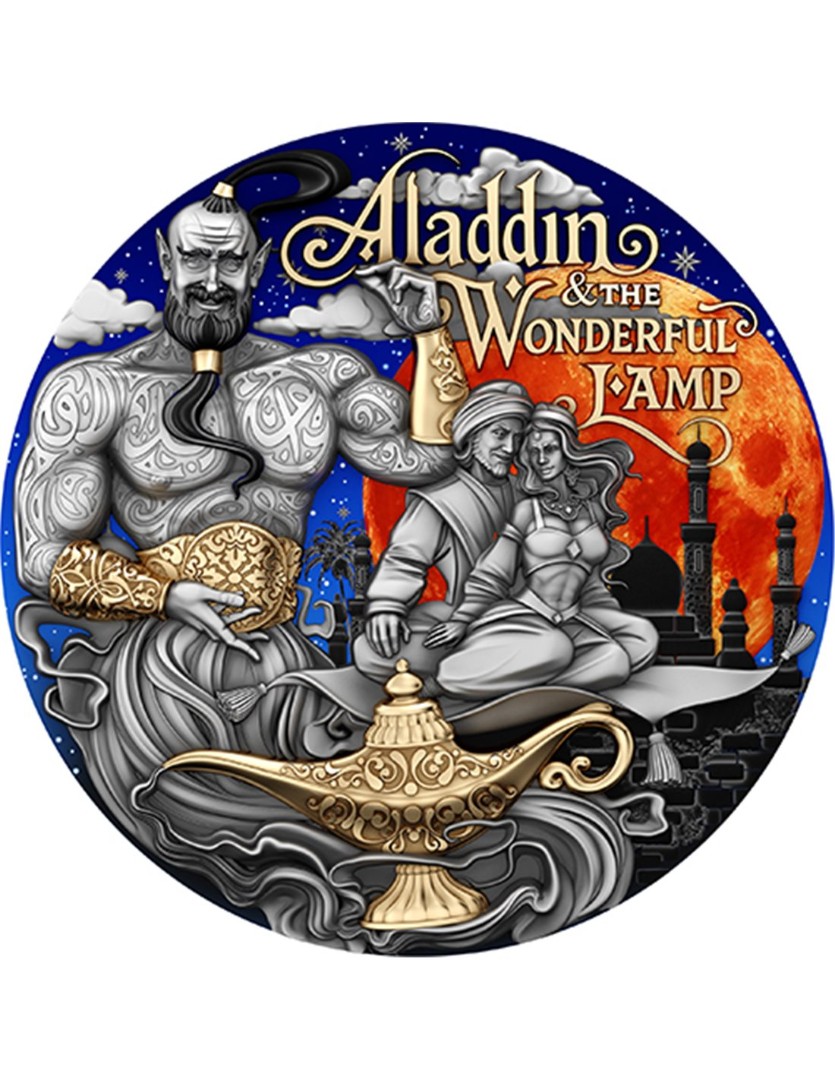 Questa affascinante moneta d'argento da 2 once fa parte della serie Fairy Tales ed è dedicata alla leggenda di Aladino, un giovane sognatore il cui coraggio ha cambiato il suo destino. Al centro del disegno c'è una scena in cui Aladdin e Jasmine si librano su un tappeto magico sotto una luna infuocata, sorvegliati dal maestoso Genio, custode dei segreti dei desideri e della libertà. La moneta presenta una finitura antica, impreziosita da una doratura selettiva e da una stampa UV di grande effetto. Viene fornita in un cofanetto con un certificato di autenticità. La tiratura limitata è di soli 500 pezzi in tutto il mondo.