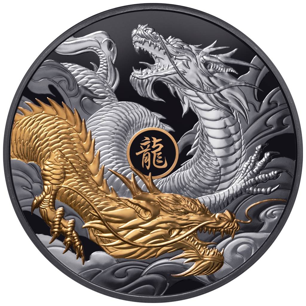 Questa imponente moneta d'argento da 5 once è dedicata al drago, il quinto animale del calendario lunare. Il rovescio presenta due draghi intrecciati, uno dei quali è evidenziato da una doratura selettiva, con il carattere cinese per "Dragon" posizionato al centro. La moneta si distingue per il design raffinato, i rilievi espressivi, gli esclusivi accenti dorati e la caratteristica qualità Black Proof. La moneta è presentata in un cofanetto di legno e accompagnata da un certificato di autenticità. La tiratura è strettamente limitata a 888 esemplari in tutto il mondo.