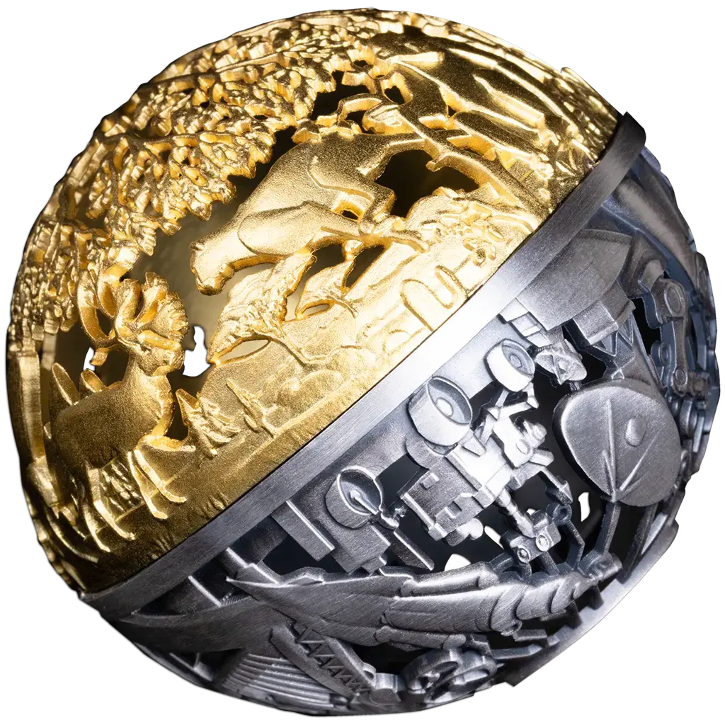 Questa straordinaria moneta d'argento sferica da 2 oncia incarna l'armonia tra le forze primordiali della natura e il rapido progresso tecnologico dell'umanità. La sua forma insolita rafforza il concetto di equilibrio, conferendo al design un carattere decisamente futuristico e memorabile. La finitura anticata, abbinata alla filigrana finissima e alla placcatura in oro 24 carati, evidenzia la profondità del concetto artistico e la maestria artigianale del pezzo. La moneta viene fornita in un cofanetto con certificato di autenticità. La tiratura limitata è di soli 1.499 pezzi in tutto il mondo.