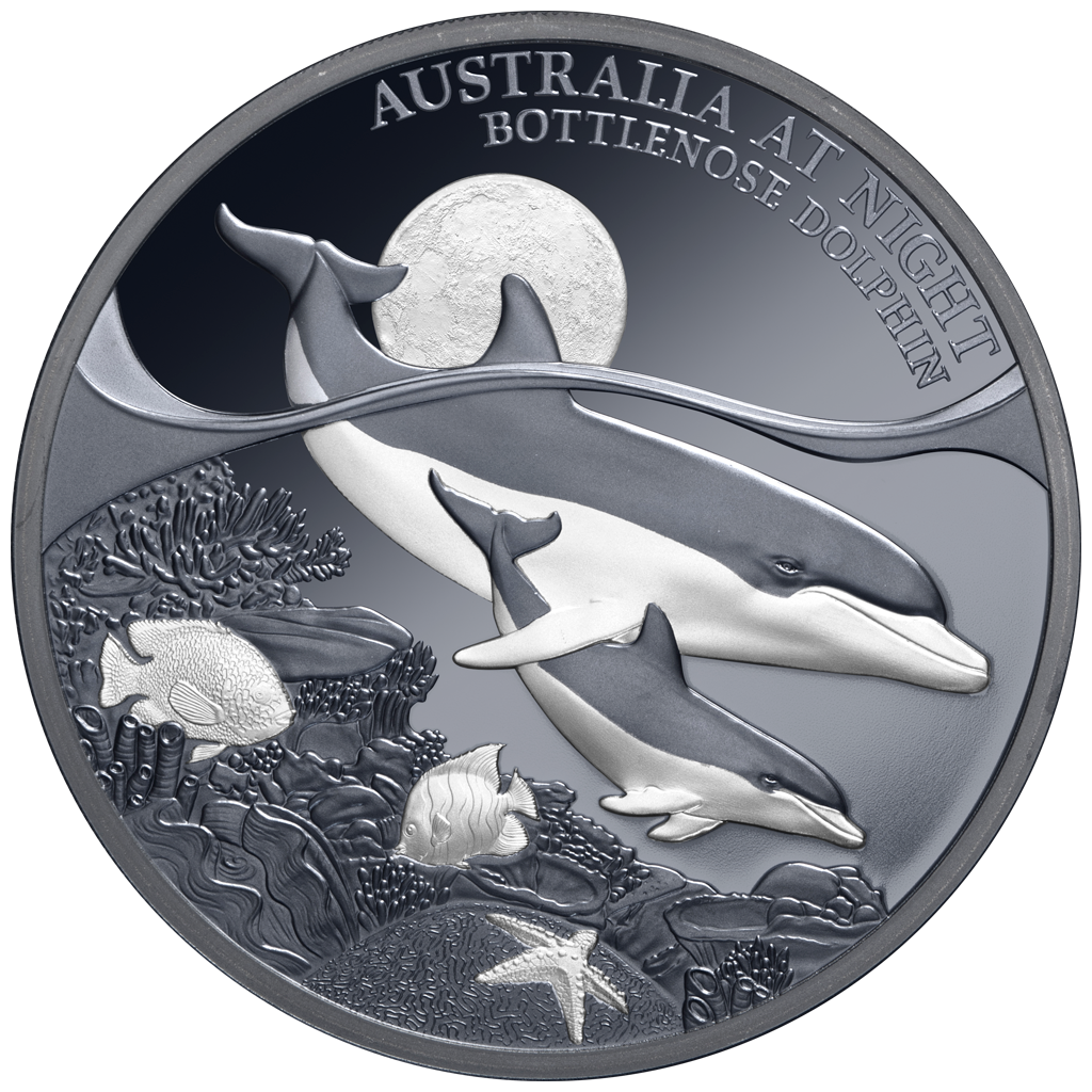 Niue: moneta d'argento da collezione Australia at Night. Delfino tursiope 2025, Proof, 31,1 g di argento puro (0,999)