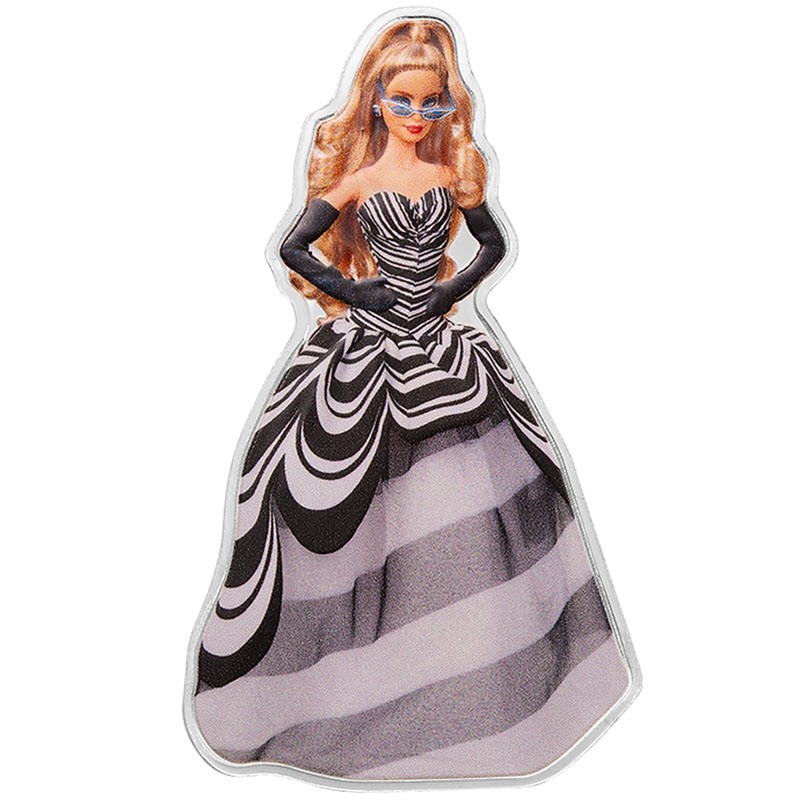 Moneta d'argento da collezione delle Isole Salomone, emessa nel 2024 e coniata da 1 oncia di argento puro 0,9999. Questa raffinata emissione celebra il 65° anniversario di Barbie e appartiene alla serie Blue Sapphire. La moneta ha una forma unica che ricorda la silhouette di Barbie e si distingue per la finitura colorata e il design accattivante. La composizione riflette lo stile iconico della leggendaria bambola, con un elegante abito in bianco e nero con un motivo audace e occhiali da sole alla moda. Il concetto artistico combina un'estetica moderna con immagini riconoscibili della cultura pop. La moneta è presentata in un cofanetto con certificato di autenticità. La tiratura è strettamente limitata a 3.000 pezzi in tutto il mondo.