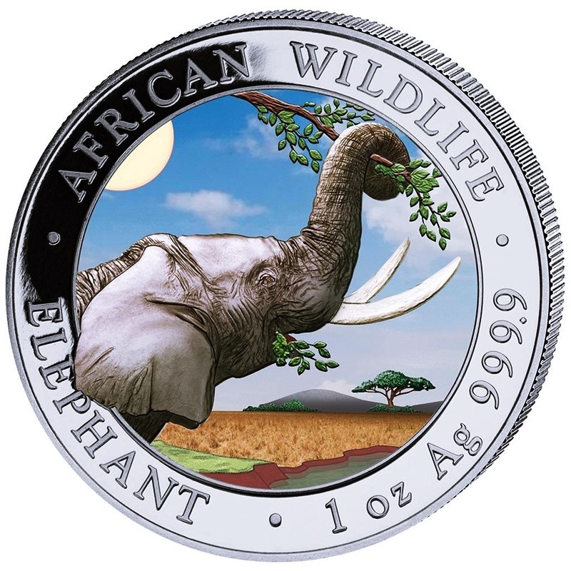 Dinamica della variazione dei prezzi Moneta d'argento della Somalia Elefante della fauna africana 2023 Disegno del giorno colorato 1 oncia