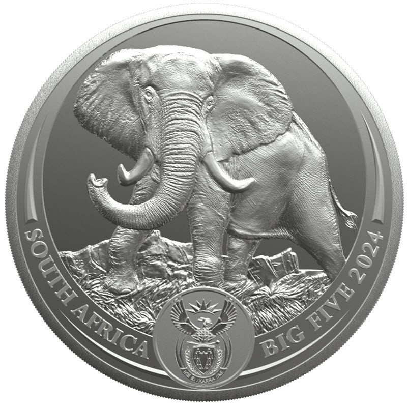 L'Elefante 2024 è la prima emissione da un chilo della nuova serie Big Five III della Zecca del Sudafrica. Coniata da 1 chilogrammo (32,15 oncia) di argento fino 0,999 in qualità Proof, questa impressionante moneta ha un taglio di 5 rand ed è strettamente limitata a soli 100 pezzi in tutto il mondo. Ogni moneta viene consegnata nella scatola di legno originale con un certificato di autenticità numerato. Questa emissione rappresenta il secondo Elefante d'argento da 1 chilo in assoluto. Il dritto raffigura un elefante africano adulto, accompagnato dalle scritte "SOUTH AFRICA", "BIG FIVE 2024" e dallo stemma nazionale. Il rovescio segue il concetto della serie: due metà della testa di un elefante formano un ritratto completo e ravvicinato quando due monete vengono accostate. Più monete disposte una accanto all'altra creano l'impressione visiva di un intero branco. Al centro sono riportate le diciture "FIVE RAND", "1kg" e "Ag 999".