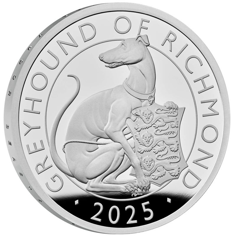 Moneta d'argento da collezione del Regno Unito, emessa nel 2025 come parte della serie The Tudor Beasts e coniata da 1 oncia di argento fino 0,999 in qualità Proof. Questa moneta rappresenta l'ottava emissione di una serie di dieci pezzi dedicata agli animali araldici della dinastia Tudor. Il disegno di David Lawrence raffigura un levriero seduto che appoggia la zampa su uno scudo con i tre leoni d'Inghilterra, con un intaglio visibile per la lancia utilizzata nei tornei medievali. La figura del levriero è storicamente legata al re Enrico VIII, che ereditò questo simbolo araldico dalla Casa di Lancaster e da Edmund Tudor, conte di Richmond. La composizione riflette l'eredità reale e le tradizioni di lunga data dell'araldica britannica. La coniazione è limitata a soli 2.760 esemplari e ogni moneta è presentata in un cofanetto originale accompagnato da un certificato di autenticità.